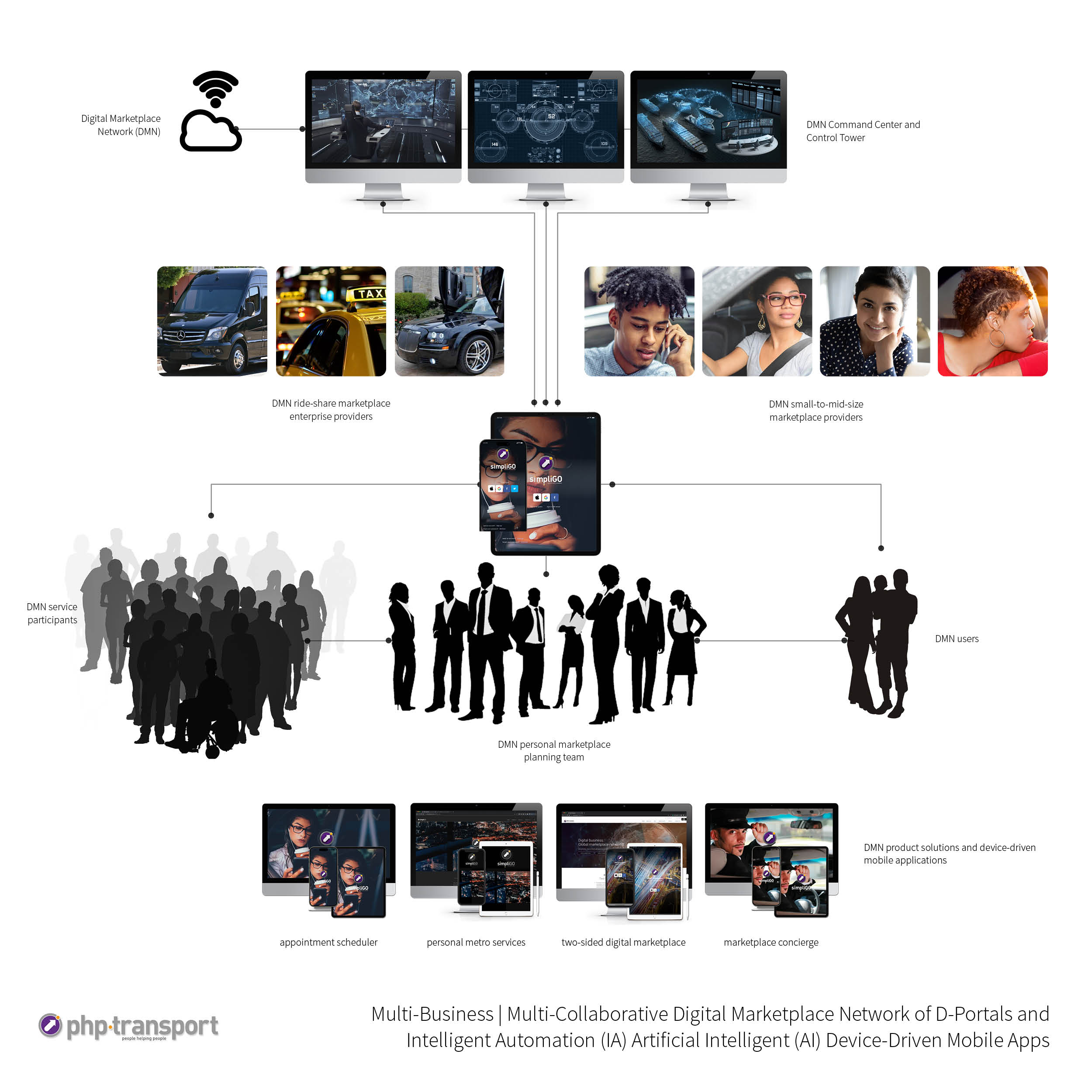 - Building a value-added value-driven digital marketplace network with consumers and interconnected multi-business communities. Providing new approaches for interacting and collaborating with them. Offering simplified and self-service on boarding for users, consumers, mobility service providers, commercial service providers, technology partners and application services, resulting in a broad range of options so that the user can choose exactly what they want without limiting their choice to a single marketplace participant.